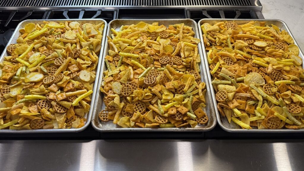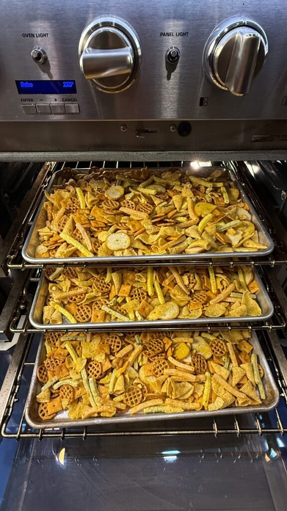 Toasting snack mixes like this isn’t about baking, but about giving the liquid coating time to absorb and dry out. A little toastiness is nice but not the goal.