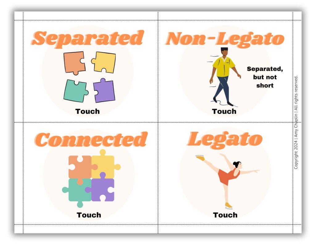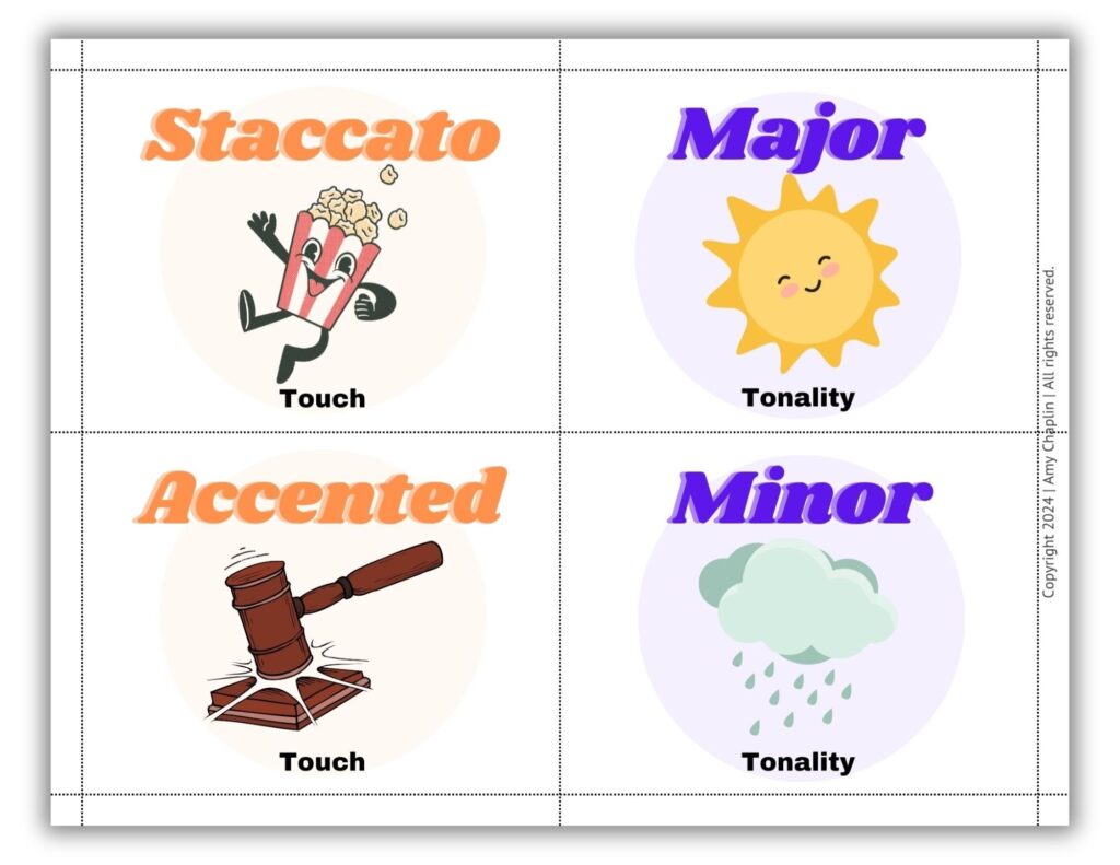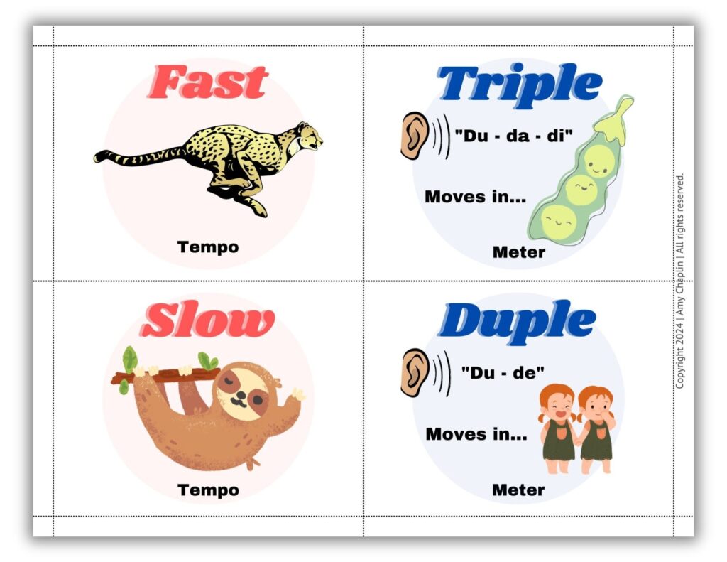 I’ve used these visual listening cards for years, but always felt a few elements were lacking in the original set that I wanted to include – such as the terms Duple vs. Triple when talking about a meter and more generalized terms, such as loud vs. soft and separated vs. connected for my very beginners.